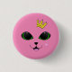 Ce bouton rond rose présente un visage de chat avec une petite couronne d'or sur la tête. Le chat a de grands yeux verts, un petit nez rose et un petit coeur rose sur la joue. L'arrière - plan est de couleur rose massif.