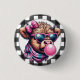 A Cute Black And White Buffalo Plaid Button With A Highland Cow Blowing A Bubble