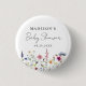 Élégant bouton de baby shower floral avec une bordure inférieure de fleurs sauvages d'aquarelle et feuillage dans les tons rose, jaune, violet, bleu et vert sur un arrière - plan blanc. Personnalisez le bouton du baby shower fleur sauvage avec le nom de la mère à être et la date. Les boutons de fleur sauvage personnalisés sont parfaits pour les baby showers de printemps et d'été.