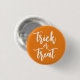 Trick ou Treat orange et blanc script moderne Halloween bouton épingle. Texte blanc sur arrière - plan orange.