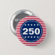 This button has two rows of white stars on a blue circle. In celebration of America's 250th anniversary, 250 is in white letters are between the stars. It has red and white stripes in the background that are reminiscent of the American flag.