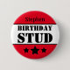 Un badge amusant pour l'étalon d'anniversaire. L'arrière - plan est rouge avec une bande blanche au milieu avec des bords noirs. À l'intérieur de la bande blanche sont les mots Anniversaire stud en lettres noires. En dessous dans la zone rouge inférieure sont trois étoiles noires. Un modèle pour ajouter le nom des garçons d'anniversaire en haut du badge.
