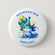 Bleu et vert Axolotl thème de la fête d'anniversaire garçon personnalisées bouton garçon d'anniversaire. Un axolotl mignon dans un casquette d'anniversaire avec des ballons.