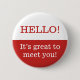Ce bouton rouge et blanc présente les messages "BONJOUR !" et "C’est génial de vous rencontrer !". Il pourrait peut-être être utilisé comme un moyen amical d'accueillir les gens.