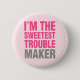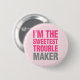 Bouton drôle pour de mauvaises filles avec la conception de typographie comportant un slogan drôle sur la lecture rose et grise "je suis le fabricant de problème le plus doux". Excuse irrésistible (ou avertissement) en cas de problème !