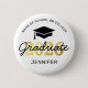Bouton de graduation personnalisée avec un casquette diplômé, 2025 en faux or, nom de l'école, nom des élèves, et le mot diplômé dans une police de script.