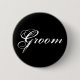 Ce bouton de recul présente un élégant design de texte blanc sur un arrière - plan noir : Groom - parfait pour les gars engagés !