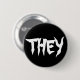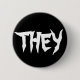 Bouton rond arrière - plan noir avec le mot "THEY" dans tous les casquettes dans une police qui est similaire à ce que les groupes de métal utilisent sur leurs pochettes d'album.
