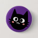 Drôle badge violet avec un dessin humoristique chat noir avec de grands yeux ronds et des joues roses dans un style dessin de doodle.
