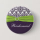 Cette damassé pourpre et blanche avec le ruban de vert de chaux de faux et le bouton de demoiselle d'honneur de bijoux assortit l'exposition de faire-part de mariage ci-dessous. Le texte est personnalisable et ainsi est la forme et la taille du bouton. Si vous avez besoin de n'importe quoi changé, envoyez svp niteowlstudio@gmail.com.