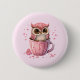 Bouton avec l'adorable image d'un hibou assis dans une tasse de café. Des coeurs se balançant et un seul rose placé au fond de la tasse.