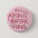 Rassemblez les amies de la mariée, les demoiselles d'honneur, les sœurs, les tantes et plus encore pour une célébration de bachelorette avec cet autocollant tendance rouge et rose "fling before the ring". Des éléments dessinés à la main comme du texte et une bague de fiançailles en diamant ainsi que des polices de caractères manuscrites donnent à ce bouton personnalisé de fête de bachelorette une ambiance tendance.