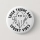 Ce design d'Halloween amusant et éffrayant comprend l'expression "Thighs épais et Vibes Éffrayantes" disposées dans un agencement circulaire autour d'une jolie illustration fantôme classique. Le fantôme, avec ses yeux simples mais expressifs, est le point central du design, lui donnant une ambiance ludique et fantaisiste. Deux petites araignées, accrochées aux mains du fantôme, ajoutent une touche de fantaisie à la conception par ailleurs légère. Le texte est audacieux et propre, créant un fort impact visuel tout en maintenant un ton ludique. Les couleurs noir et blanc donnent à l'ensemble un aspect intemporel et polyvalent, ce qui le rend parfait pour Halloween.