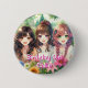 Bouton fille d'anniversaire mignon à thème animé. Trois mignonnes filles animées sur le pré-ado ou l'adolescent, avec des fleurs roses et jaunes autour d'eux.