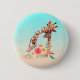 Un bouton avec un joli dessin en aquarelles d'une maman et d'une petite girafe. La girafe mère se repose la tête au-dessus de la petite girafe, aimante et adorable. Joli bouquet de fleurs d'aquarelle rose, jaune, vert placé sous cette paire de chatons. Un arrière - plan dégradé de bleu turquoise délicat qui se fond dans une couleur sable brun.