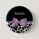 A cute black and white giraffe print button with a girly lavender purple ribbon tied into a feminine bow. Personalize this pretty animal print name tag by adding your name. Flat printed image, not actual bow.