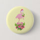 Un bouton avec un flamant de Noël à thème tropical portant un chapeau de santa rose. Sous ses pieds se trouve un bouquet de sucre de canne avec de jolies fleurs tropicales et des baies roses. Un bourgeon de saint sur sa poitrine.