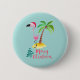 badge de bouton tripical festif avec une jolie illustration d'un flamant rose dans un chapeau de santa rouge. À côté d'un palmier vert sur un monticule de sable jaune. Un design d'arbre de Noël tourbillonnant est placé à côté du texte Joyeux Noël. Écrit dans la couleur rose dans une police manuscrite fantaisie. Arrière - plan vert pastel.