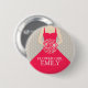 Élégante fille de fleurs graphiques avec peau pâle dans une robe rouge tenant un poteau de broche stylisée roses rouges badge bouton. Lit Flower Girl Emily, Ou personnalisez avec vos propres noms de filles de fleurs. Idéal pour les douches nuptiales, les répétitions mariages ou pour ajouter aux sacs de faveur de mariage. Art original et design par Sarah Trett www.sarahtrett.com pour www.mylittleedenweddings.com sur zazzle