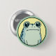 Cute round button/pin of funny green cartoon frog with big eyes and a deadpan look on his face on a yellow and green background.
