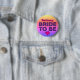 Joli badge à broche pour votre enterrement de vie de jeune fille. En haut du badge, le nom de la mariée est inscrit en lettres roses avec un contour noir, il s'agit d'un modèle pour remplacer le nom d'exemple dans la zone de texte par le vôtre. En dessous, en texte violet avec un contour noir, se trouvent les mots Future Mariée. Au bas du badge, un cœur d'amour rose mignon avec un contour noir complète l'apparence générale. Le fond est un design de faux strass dans un dégradé de jaune, rose et violet.