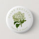 Aidez votre fête de mariage à se connaître avec ces boutons joliment simples et amusants portatifs avec texte de nom facile à customiser, élégant, voûté le rôle de titre qu'ils joueront le jour de votre mariage. Le texte vert chic de la sauge encercle une illustration antique d'une fleur d'hydrangée blanche dans un joli style jardin, grand-millénaire.