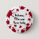 Un bouton amusant pour Halloween avec des éclaboussures de sang dessus et le texte "Bienvenue, je serai votre infirmière aujourd'hui".