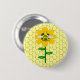 Ce bouton présente une image graphique d'un joli bourdon jaune avec rayures noires, yeux, antennes et jambes. Il possède de jolies ailes bleues et blanches. L'abeille est assise au milieu d'un tournesol jaune doré. La fleur a une tige verte et trois feuilles. Le message "happy bee day" (Jour heureux des abeilles) apparaît sur les trois feuilles. L'arrière - plan est composé d'un motif jaune peigne.