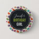 Bouton d'anniversaire personnalisé qui dit "Fille d'anniversaire" avec un mignon motif de macarons dans de nombreuses couleurs différentes avec un faible motif de pois derrière.