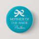 Aqua personnalisé / bleu turquoise et blanc mère des boutons de badge nom de la mariée avec petit ruban de cravate arc et police élégante. Idéal pour la fête de bachelorette chic, douche nuptiale classe, week-end de filles amusantes et de beaux mariages. Design rond élégant. Posh et épingles mignonnes ! Faites votre propre pour les femmes de ménage chic, la servante d'honneur, le matron d'honneur, la fille de fleurs, la mère de la mariée, la mère du marié et d'autres membres de l'entourage des épouses, etc. Accessoires wedding planners pour l'équipage de la mariée. Couleur personnalisable.