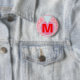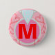 Joli arrière - plan rose pâle avec des notes de musique rouge formées en formes de coeur. Personnalisez avec votre initiale monogrammée en texte rouge au centre de l'anneau de diamant bleu à facettes platine. Épingle de bouton amusant pour n'importe quel âge. Bon cadeau romantique ou amoureux. Conception originale © TamiraZDesigns