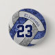 Ce bouton de volleyball personnalisé couleur équipe pour les filles dispose d'un graphique de volleyball bleu, gris et blanc qui a un motif kaléidoscopique floral girly mélangé avec des panneaux de volleyball bleu et gris et un motif tourbillon abstrait mélangé avec des panneaux blancs - son nom et numéro de maillot sont personnalisables - par katz_d_zynes