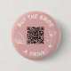 Ce bouton fantaisie est parfait pour une soirée d'enterrement de vie de jeune fille branchée ! Avec son fond rose élégant, son message "Offre une boisson à la mariée !" en gras, un verre à martini fantaisiste et un code QR pratique, ce bouton sera un succès auprès de votre groupe d'amies et des invités. C'est une façon amusante et facile de collecter des dons pour le grand jour de la mariée, en ajoutant une touche d'excitation et de rire aux festivités.