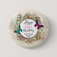 Un bouton pour un anniversaire. Conçu avec de jolis papillons roses et verts qui flottent autour. Un cadre circulaire soigné et orné avec les détails de votre anniversaire superposés un collage vintage défraîchi avec des roses roses et d'autres éléments décoratifs. Une ambiance chic et désuète.