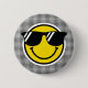 Happy Face Emoji en jaune, noir, blanc avec lunettes de soleil en noir sur en vichy chèque arrière - plan en noir, blanc. Peut ajouter du texte facultatif. Bouton idéal pour N'IMPORTE QUELLE personne, jour, événement, occasion. Designer, Retro, Cool. Mélanger et faire correspondre la collection Smile Face entière par TMCdesigns.