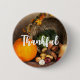 Bouton avec la photo d'une récolte d'action de grâce, posé sur une table en bois rustique. Citrouille, pommes de terre, courge etc... composent cette belle collection de nourriture. Des feuilles d'automne colorées entourent le panier de la cornucopie.