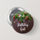 Bouton fille d'anniversaire avec une photo rustique d'une table en bois marron avec pinecones, aiguilles de pin, neige et ornements de Noël. Festif et adorable.