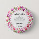 Customize-able button pin has a pretty tulip print and a royalty crown.
