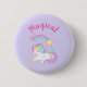 Bouton avec une adorable licorne blanche avec crinière et queue bouclées vert pastel, violet, jaune et rose. Cette créature magique s'allonge en train de dormir paisiblement avec une étoile filante de couleur arc-en-ciel volant au-dessus. Texte "Magique" dans une police rose tendance. Arrière - plan de pois pastel violet et blanc.