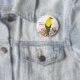 A button pin decorated with a bright yellow and black American Goldfinch bird perched on a pretty pink rhododendron flowering bush inspired by the State of Washington bird and flower painted with watercolor.