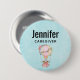 Bouton personnalisé avec un design adorable avec une illustration aquarelle. Une montgolfière ornée de jolies fleurs rouges et roses. Un mignon petit ours blanc est assis dans le panier. Arrière - plan bleu clair.