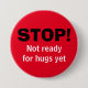 Bouton rouge moderne avec un message simple qui dit STOP, NOT READY FOR HUGS ENCORE en typographie blanche et noire. Le texte en noir est PERSONNALISABLE, vous pouvez donc créer votre propre message personnel "Keep Away" ! Une façon idéale de résoudre le dilemme de l'accolade ou du coude. Disponible en d'autres couleurs.
