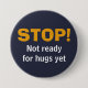 Bouton bleu marine élégant avec un message simple qui dit STOP, NOT READY FOR HUGS YET dans la typographie jaune et blanc gamboge. Le texte blanc est PERSONNALISABLE, vous pouvez donc créer votre propre message personnel "Keep Away" ! Une façon idéale de résoudre le dilemme de l'accolade ou du coude. Disponible en d'autres couleurs.
