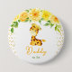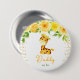 Ce bouton mignon et capricieux peut être personnalisé avec un nom ou un titre, comme papa, grand-père, oncle, grand frère etc. Le design se compose d'une adorable girafe avec une couronne de fleurs et des arrangements floraux jaunes avec des confettis de parties scintillant en faux or. Le texte combine écriture manuscrite et polices sans serif pour un look élégant et moderne. Idéal pour un baby shower à thème girafe. Graphiques par heyiamalice et SunflowerDayLove