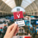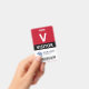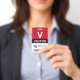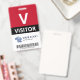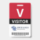 Badge de visiteur vertical avec un grand V contre un arrière - plan blanc. Visiteur en lettres propres. Ajoutez votre logo et votre code à barres. badge de visiteur personnalisé avec logo et code barre dans un design minimaliste en rouge, blanc et noir.