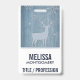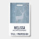 Nom badge avec un arrière - plan en faux bois de couleur bleue. Le dessus est recouvert d'une silhouette de renne avec de gros bois.