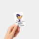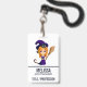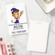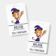 Nom badge avec une mignonne sorcière portant un grand casquette de sorcières violettes. Sa chatte noire se reposant sur le dessus de sa tête. Elle a de longs cheveux orange et porte un balai. Belle illustration de dessin animé parfaite pour l'halloween.