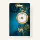 Turquoise, textured, steampunk background with brass and gold gears, a silver key and the clock. Steampunk style.