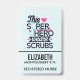 Badge avec une phrase mignonne et géniale. Le texte de typographie dit : Ce super-héros porte des scrubs. Conçu avec un stéthoscope bleu clair et un grand cœur rose et une ligne de surveillance cardiaque rose. Un fond bleu clair avec des pois roses délavés.