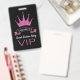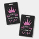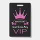 Élégant et élégant badge personnalisé pour célébrer un anniversaire de sweet sixteen. Monogrammé avec nom de fille d'anniversaire. Offrez à VIP tout l'accès à vos invités. Belle couronne de parties scintillant faux rose et style typographique moderne. Thème classique noir, blanc et rose.